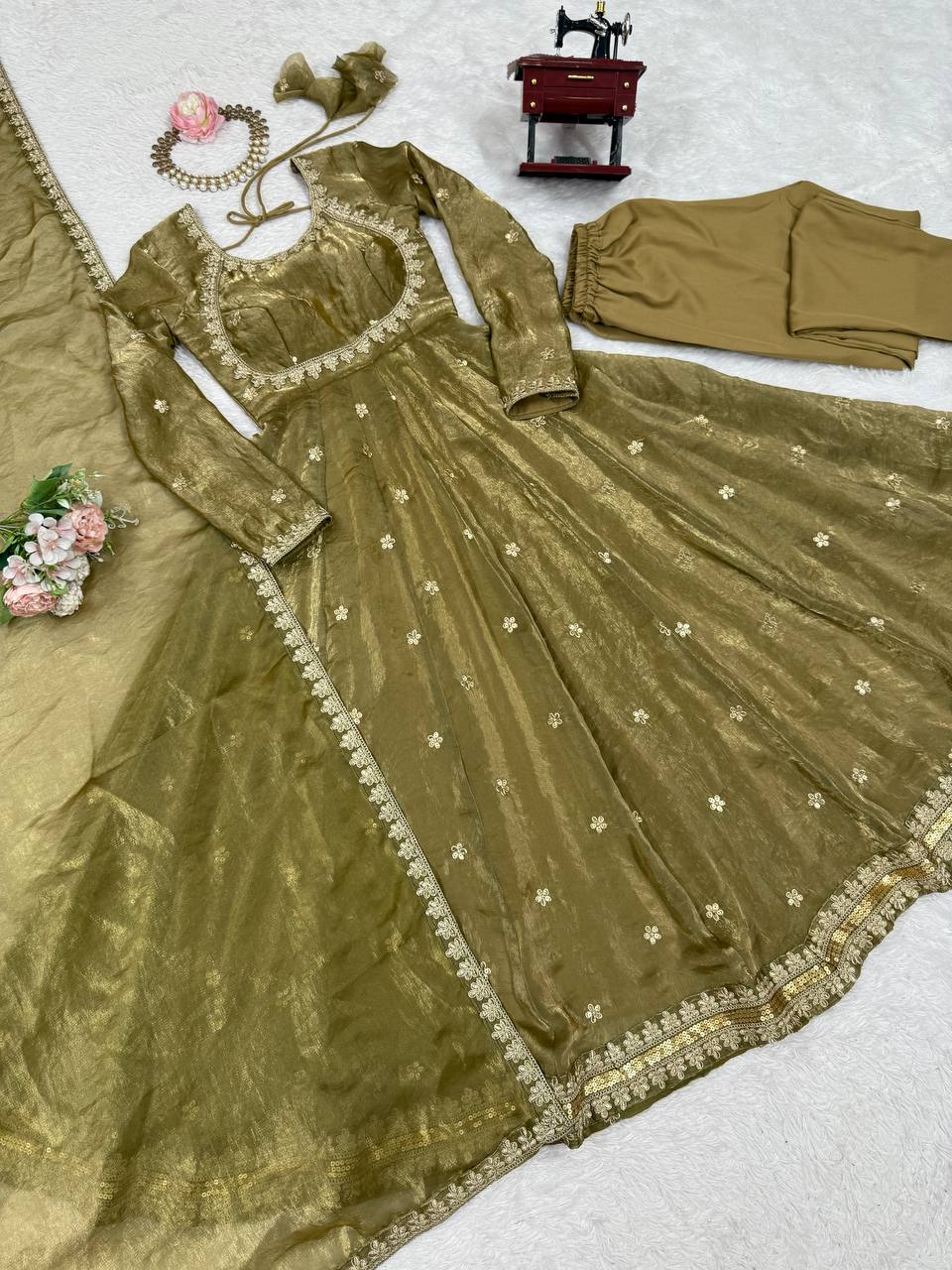 Premium Fandy Silk Gown with detailed coding & sequence embroidery (front & back)