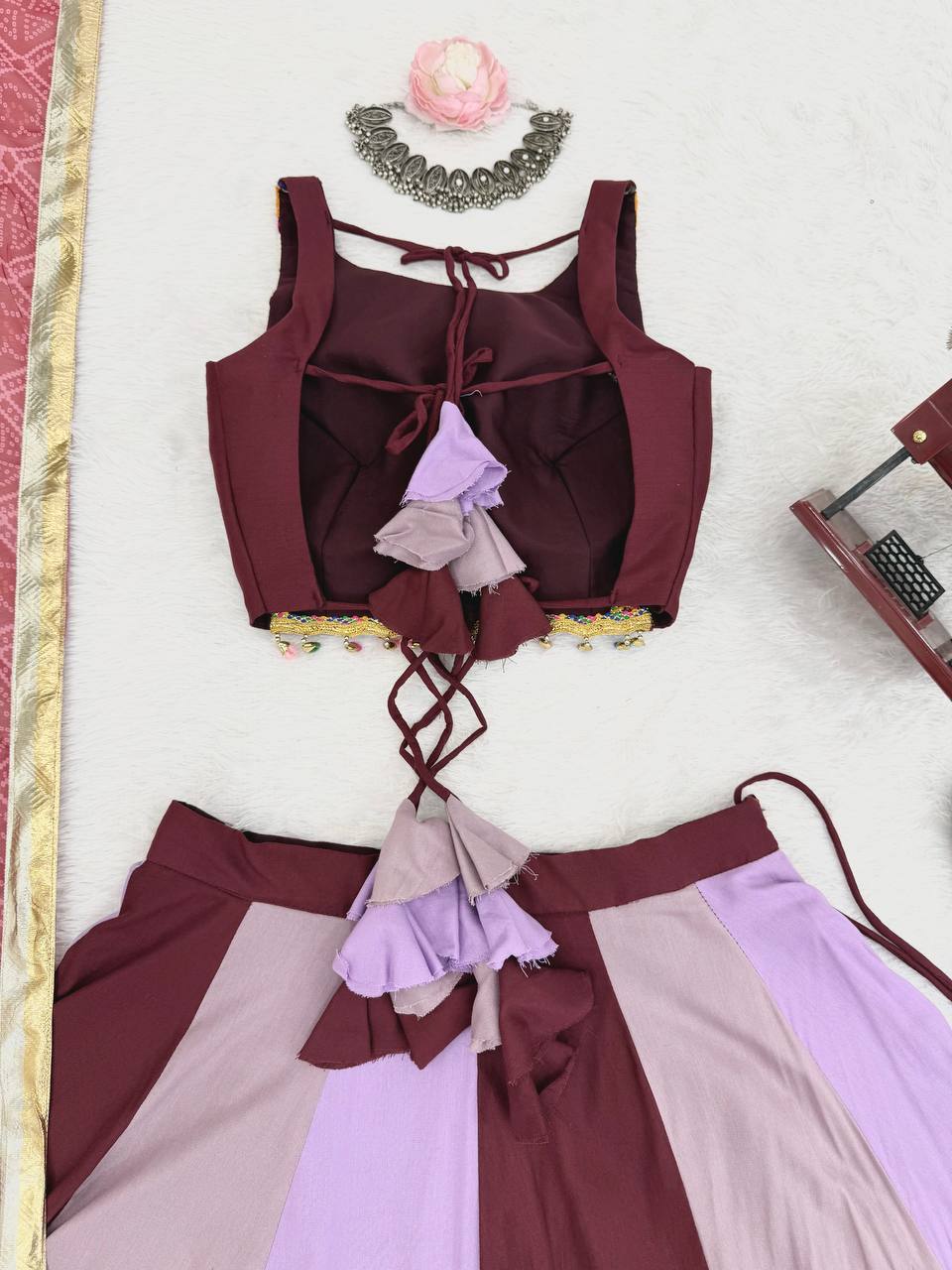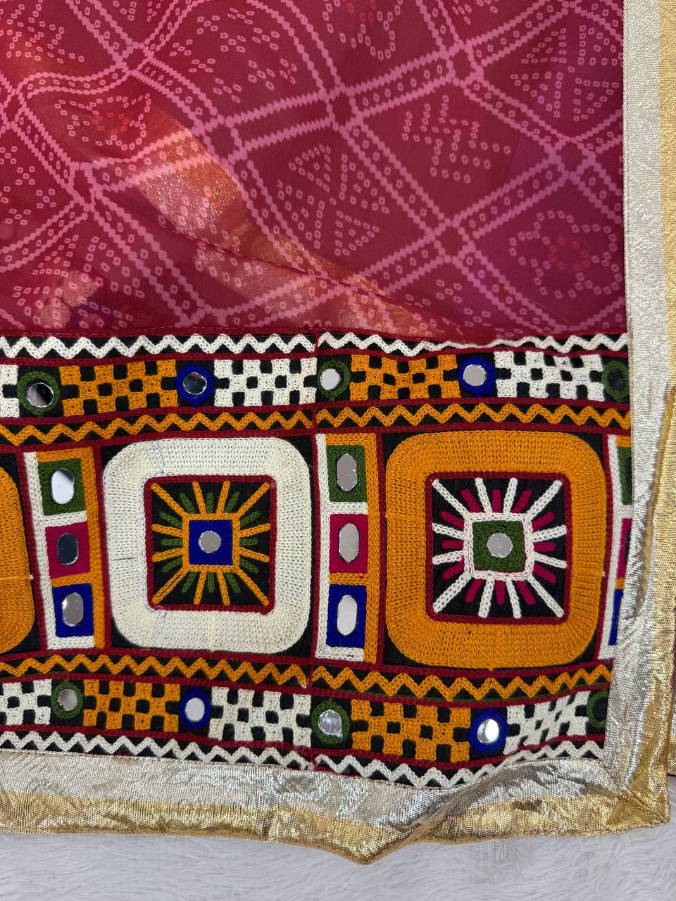 Celebrate the festive season with our Navratri Special Lehenga Choli, crafted in heavy rayon with stunning Gamthi thread work and real mirror embellishments.