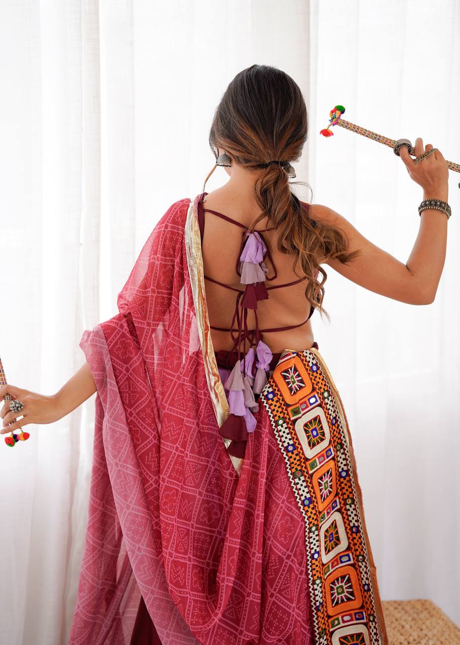 A faux georgette dupatta with digital print and Gamthi thread work (2.2 meters) completes this elegant look. Comes ready-to-wear with a padded blouse, strips, and tassels for hassle-free styling.