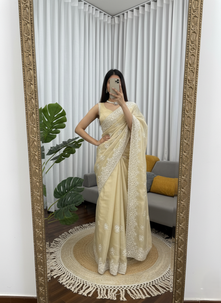– Work: Coding with Thread Work Embroidery to complement the saree design