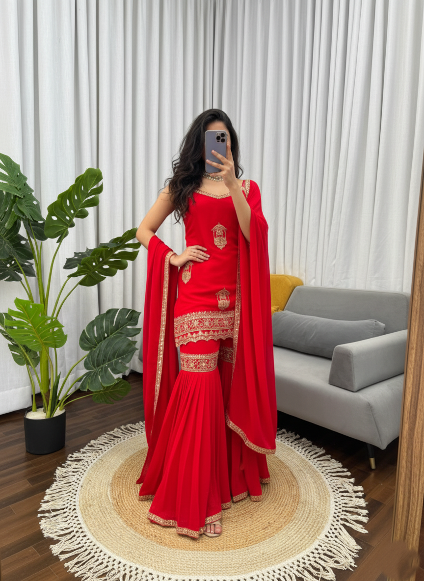 Shop Wedding Special Fox Georgette Top Sharara Dupatta Set Online – Fully Stitched & Ready to Wear!